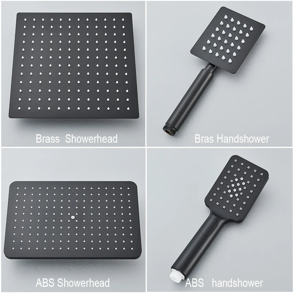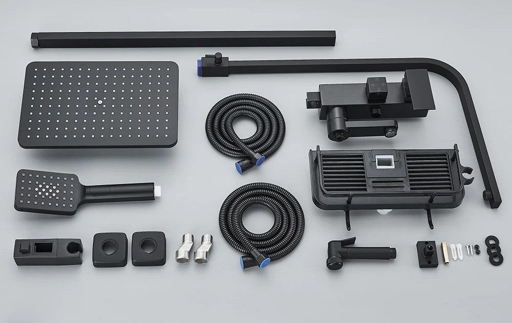 Mitigeur de Douche en Laiton Noir Mat avec Douche Pluie, Robinet et Étagère Intégrée
